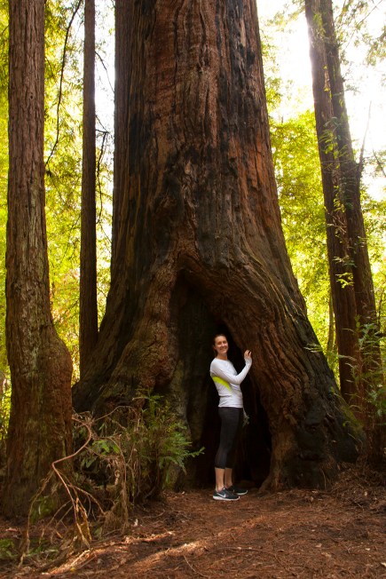 Our friend Sarah getting up close to an old-growth redwood.