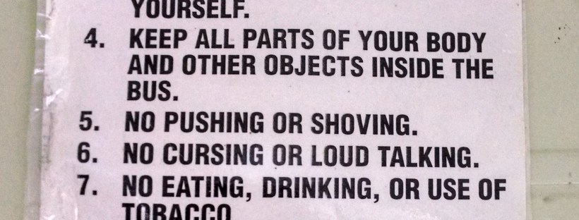 So, when we first purchased our bus, it came with this set of rules posted in numerous locations throughout the interior. Well folks, with the exceptions of number 5 and the tobacco portion of number 7 , we've cruised past every single one of these babies. I suppose we could hold smokers-only wrestling matches on … Continue reading Flouting Authority